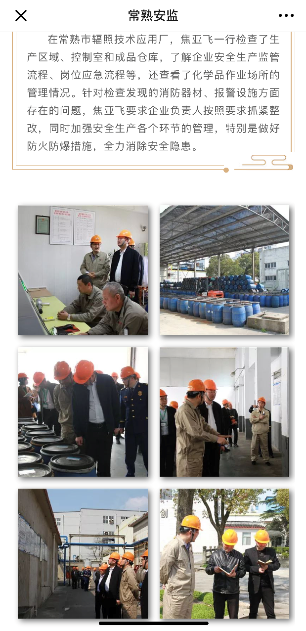 In the afternoon of March 25, 2019, Mayor Jiao Yafei and his delegation inspected the production area, control room and finished product warehouse, inquired about the safety production supervision process and post emergency process of our factory, and also checked the management of chemical workplaces. In view of the problems found in the inspection of fire-fighting equipment and alarm facilities, Jiao Yafei asked us to rectify as required, strengthen the management of all aspects of safety production, especially fire and explosion prevention measures, and try our best to eliminate potential safety hazards.